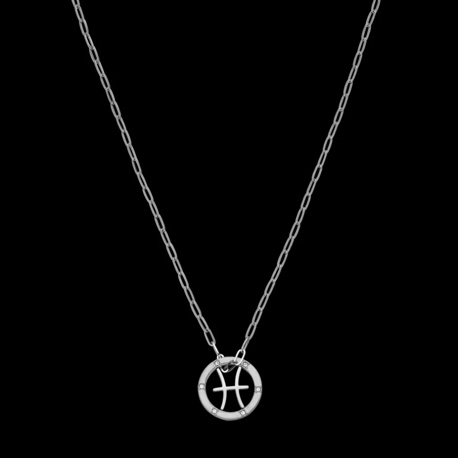 Der Runde Anhanger An Der Zodiac Halskette Aus Auffalligen Kettenelementen Tragt Das Glanzend Polierte Symbol Fur Das Sternzeichen Fische In Der Mitte. Der Rand Ist Mit Schmucksteinen Verziert Und Matt.