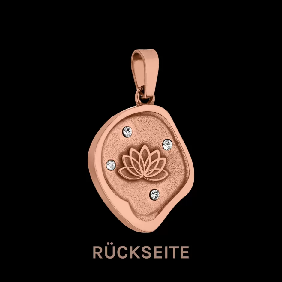 Asymmetrischer Anhanger Mit Vulkan-Motiv Auf Der Vorderseite Und Purelei Logo Auf Der Ruckseite. Verziert Mit Funkelnden Schmucksteinen.