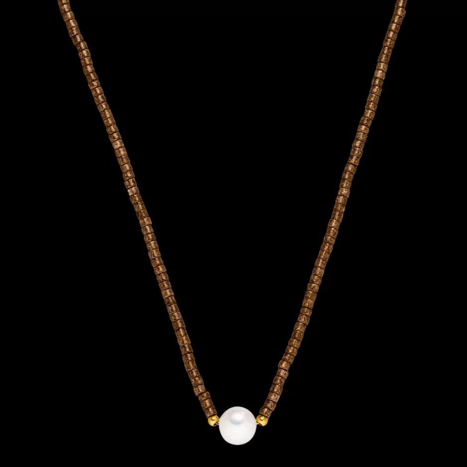 Die Coconut Kette Tragt Eine Schimmernde Perle In Der Mitte, Die Von Aufgereihten Braunen Scheiben Eingerahmt Wird.