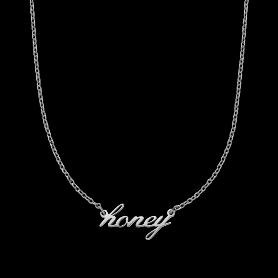 Honigsuse Halskette, Die Mit Dem Wort „Honey“ In Geschwungener Schrift Verziert Ist.