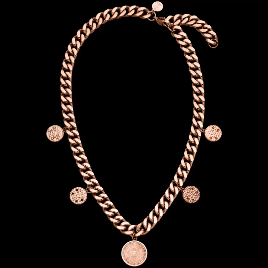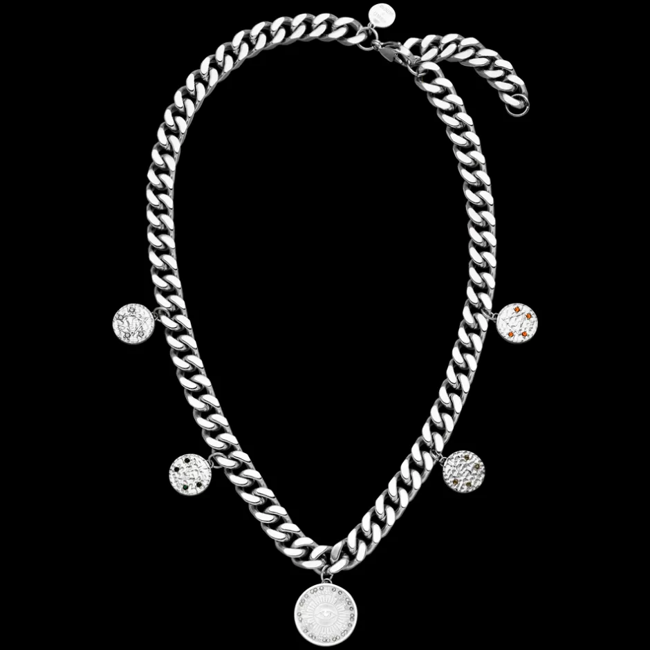 Statement-Kette Mit Gehammerten Anhangern. Der Mittlere Der Funf Coins Sticht Mit Seinen Aufwendingen Details Besonders Hervor.