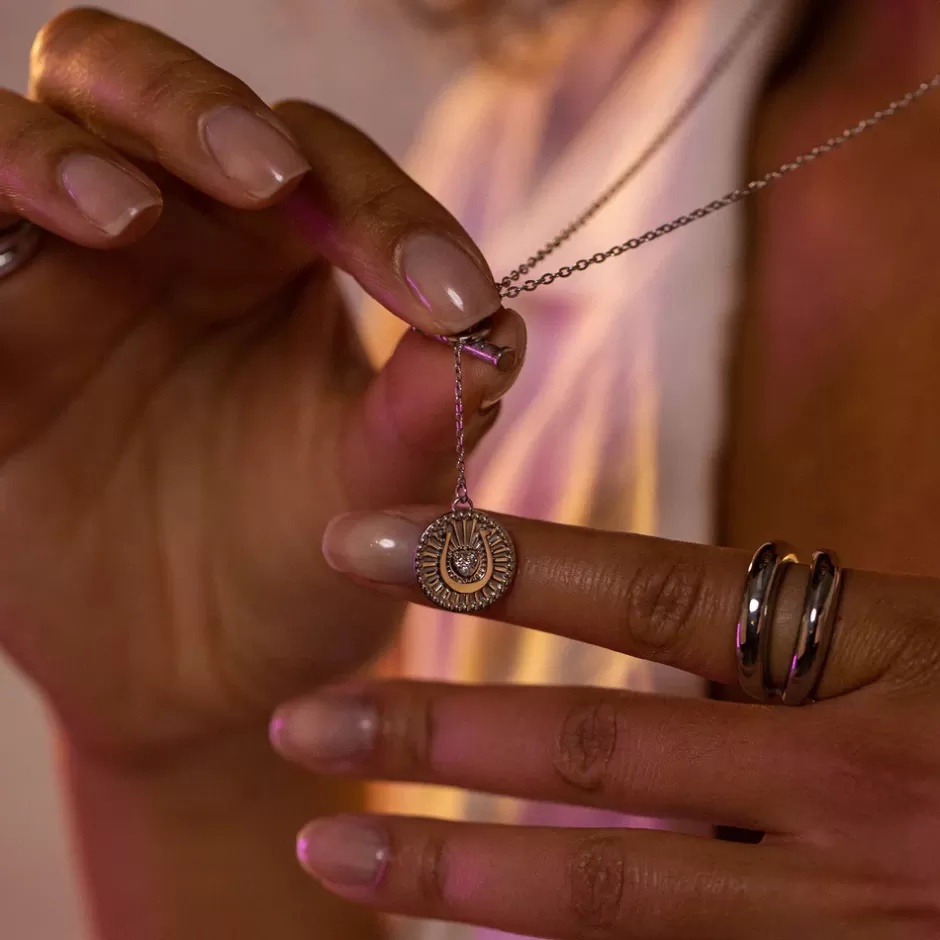 Filigraner Anhanger Mit Verziertem Coin. Die Vorderseite Zeigt Abstrakte Formen, Ein Hufeisen, Sowie Einen Schmuckstein. Auf Der Ruckseite Ist In Grosbuchstaben Der Schriftzug Luck (Gluck) Eingraviert. Fur Die Knebel-Ketten Der Personalized Collection Geeignet.