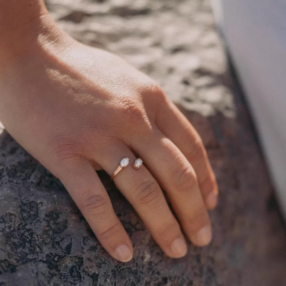 An Der Gedrehten Kette Des Hapuna Sets Befindet Sich Eine Glanzende Muschel, Die Von Einer Schimmernden Perle Gekront Wird. Der Grosenverstellbare Ring Fasst Ebenfalls Zwei Perlen Ein.