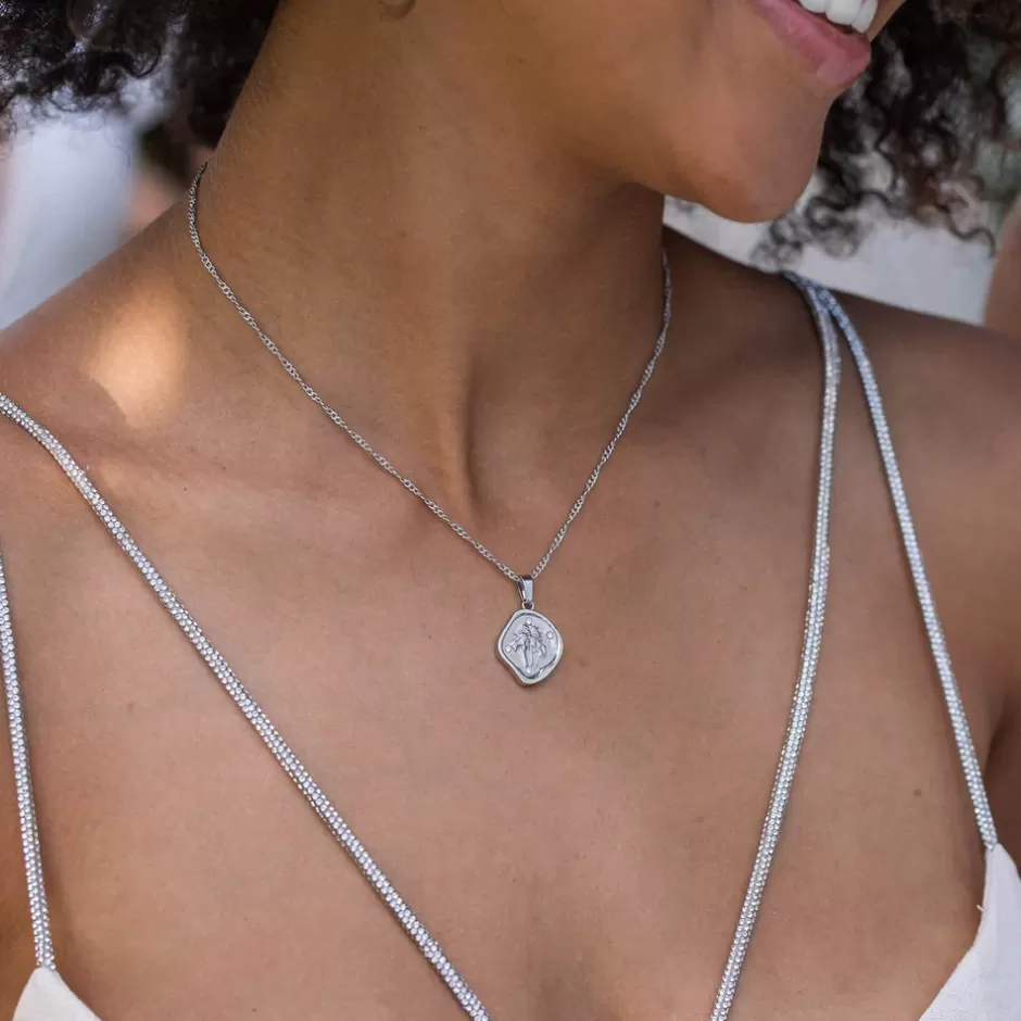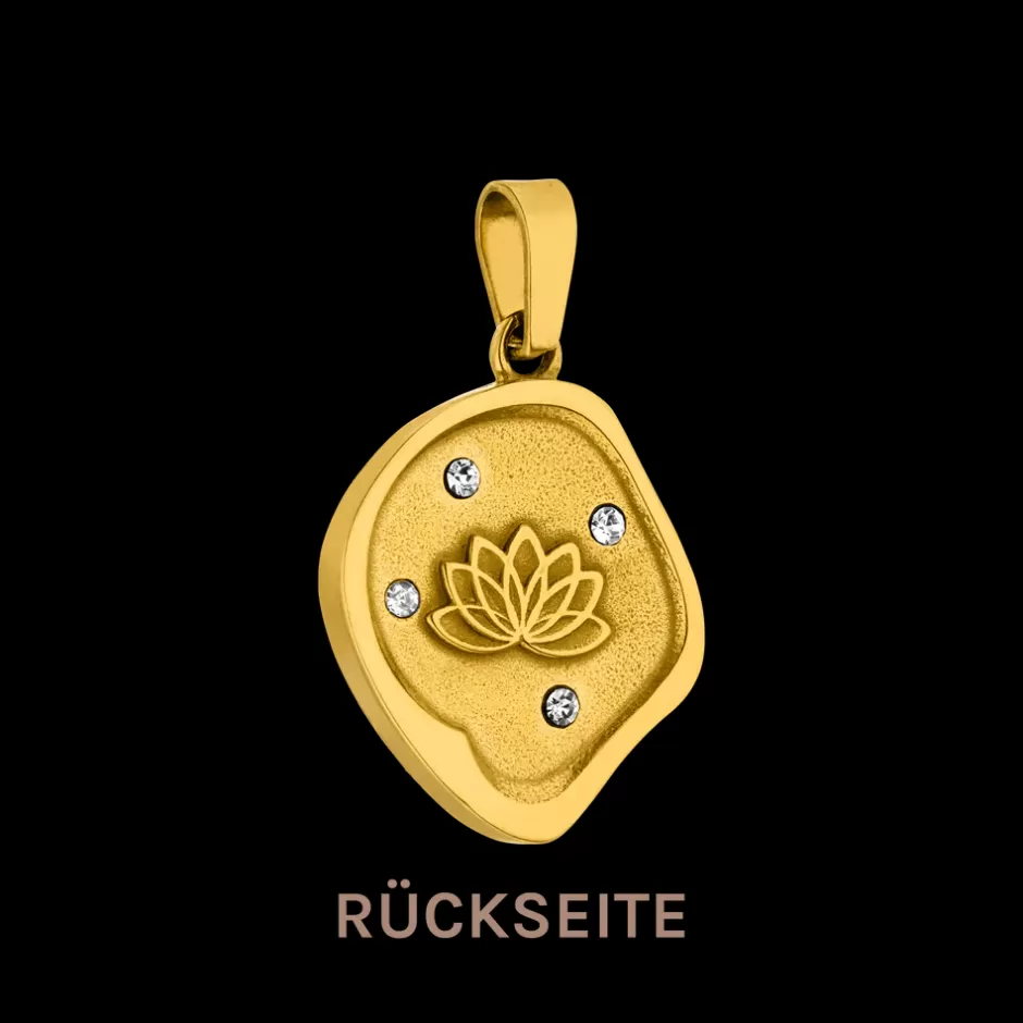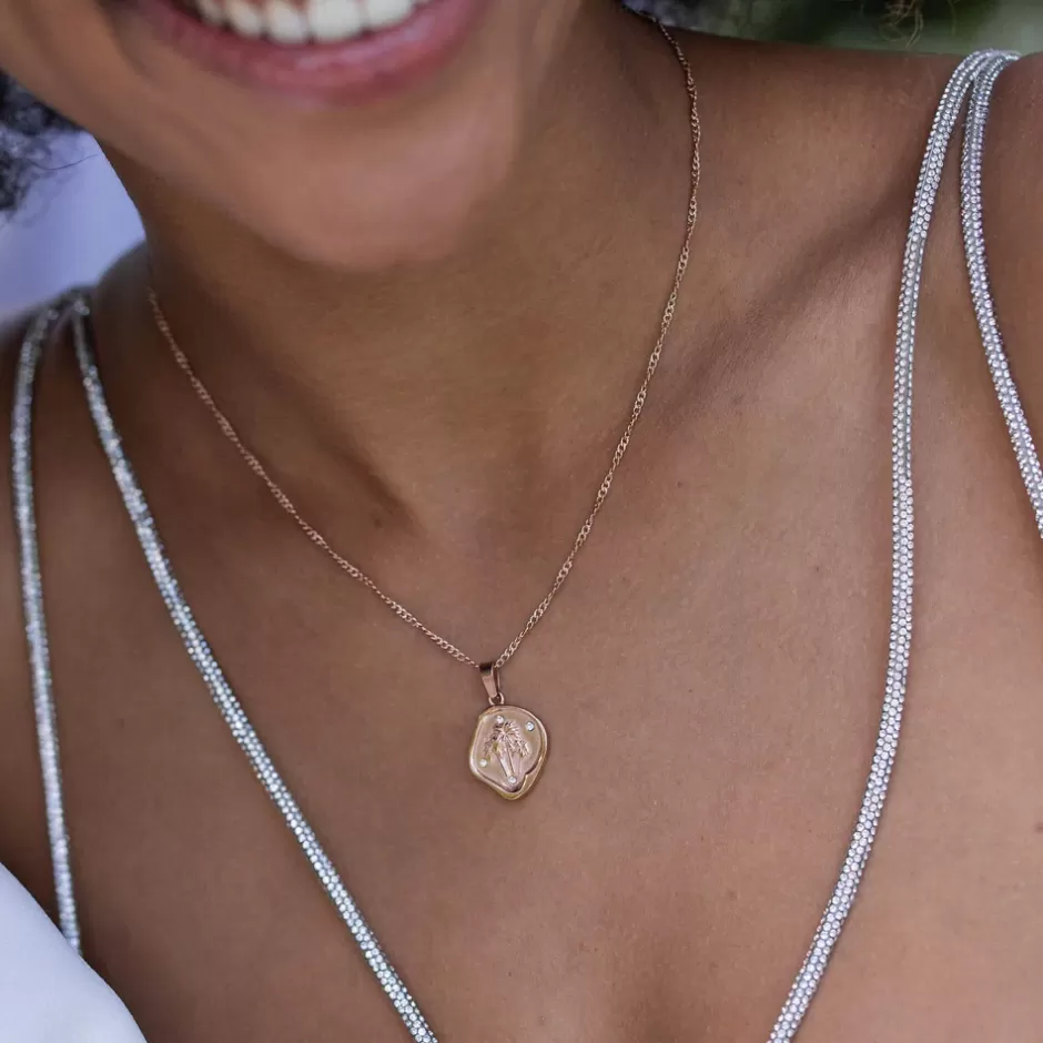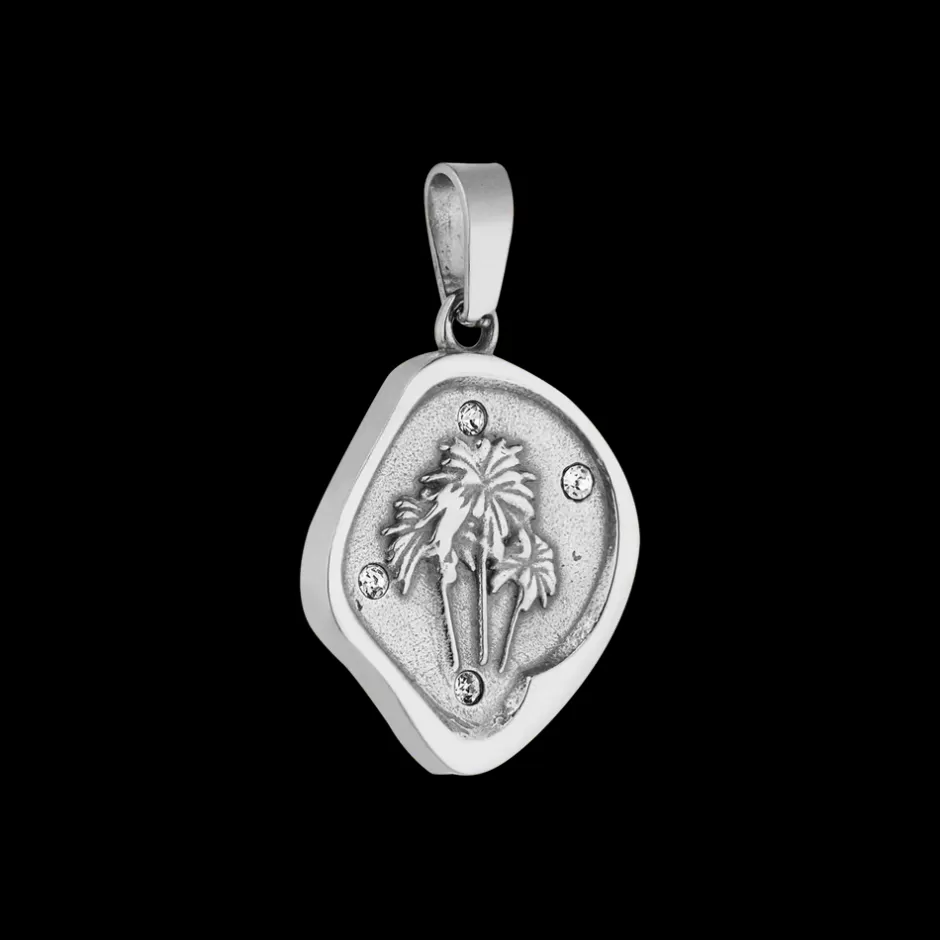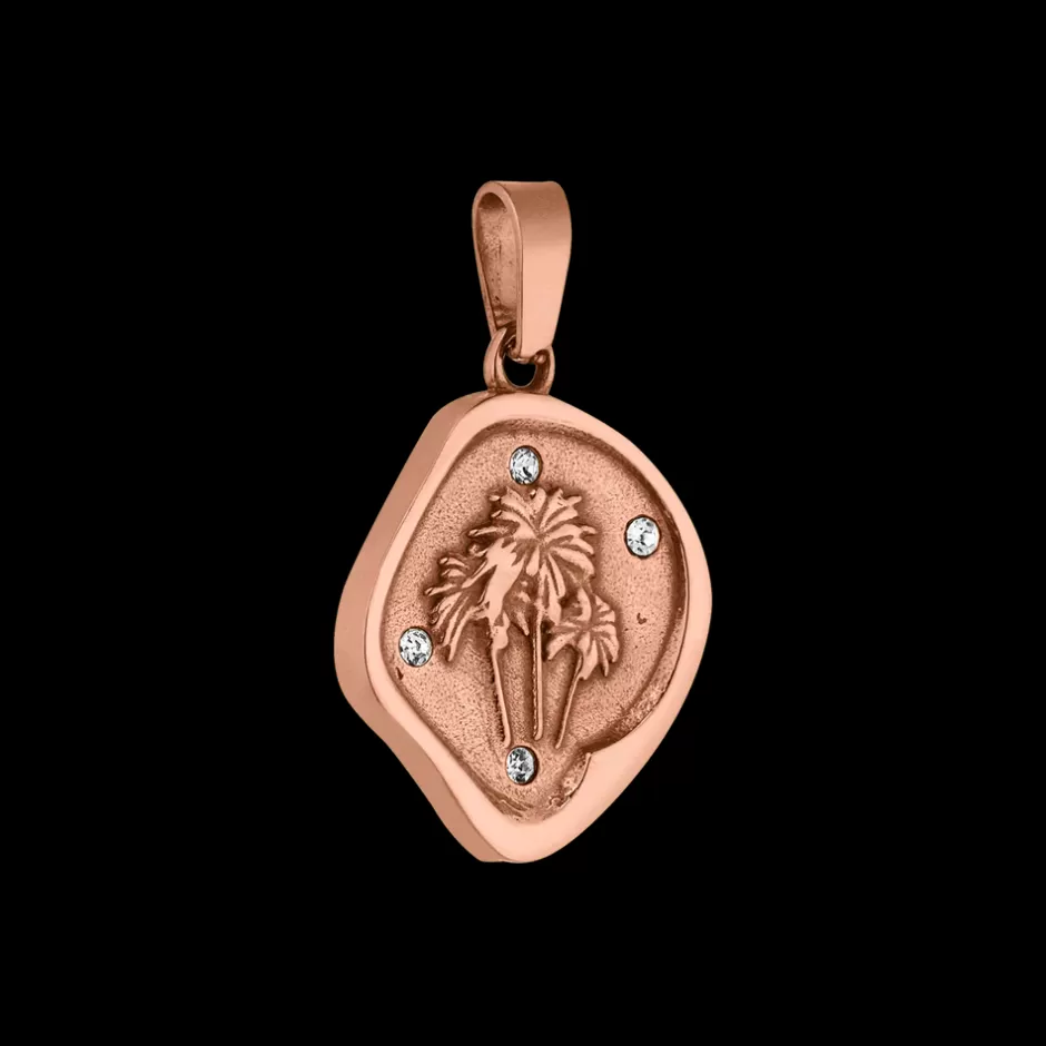 Asymmetrischer Anhanger Mit Palmen-Motiv Auf Der Vorderseite Und Purelei Logo Auf Der Ruckseite. Verziert Mit Funkelnden Schmucksteinen.