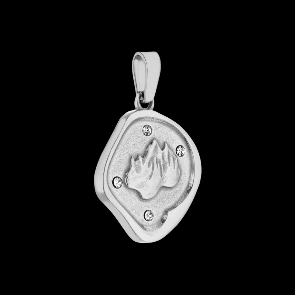 Asymmetrischer Anhanger Mit Vulkan-Motiv Auf Der Vorderseite Und Purelei Logo Auf Der Ruckseite. Verziert Mit Funkelnden…